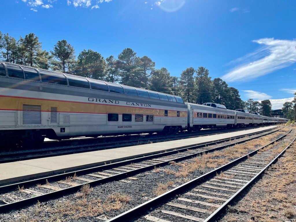 In the fall of 2022, my wife and I took a trip to Arizona. While there, we decided to visit the Grand Canyon by way of train. The Grand Canyon Railway provided an outstanding way to reach the canyon. Our visit started with a wild west gunfight in the town of Williams before preparing to board the train. We chose seating in the observation car on the way there, but in the coach on the way back. This was a money-saving decision, and we didn’t feel like we missed anything on the way back. The observation car was clean, comfortable, and luxurious. Drinks and snacks were available to us and included with our ticket. There was also a singing cowboy who made his way through the train, providing live entertainment for all. We went down to the lounge area, which was directly below the observation area. The lounge was plush with period couches and a buffet of snacks, again included with our fare. We then walked back to the end of the train. There was no caboose, as you might expect, but the last car had an observation area on the back.