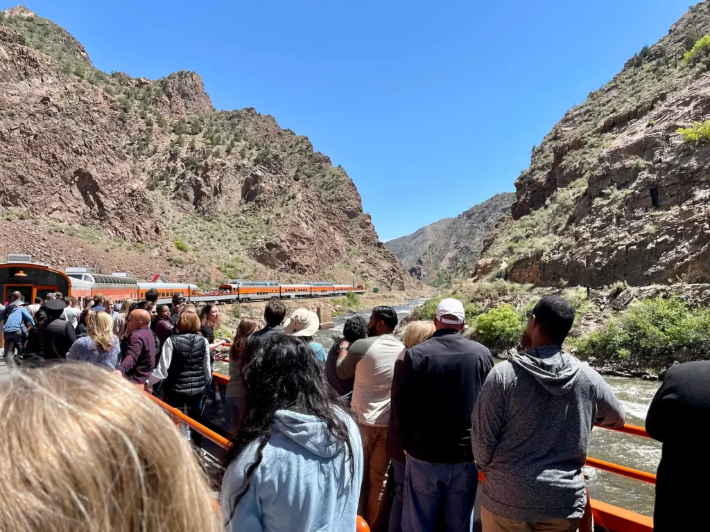 Outdoor observation cars were accessible to all passengers, so you could move about from your seat to an outdoor area to enjoy the canyon views. The train follows the Arkansas River as it winds through the gorge. When you reach the tallest point of the gorge, you start to see a footbridge that crosses the canyon high above. We saw goats, rafters, and even a fault line as we paralleled the river. The train passed a glamping site complete with yurts and airstream trailers that were located right on the banks of the Arkansas River. The views were outstanding, and there was something different around every corner of the gorge. You could see the length of the train as it slithered around each corner, winding through the canyon. On the way back, we stopped at the bridge for a moment for what I assume was a picture opportunity.