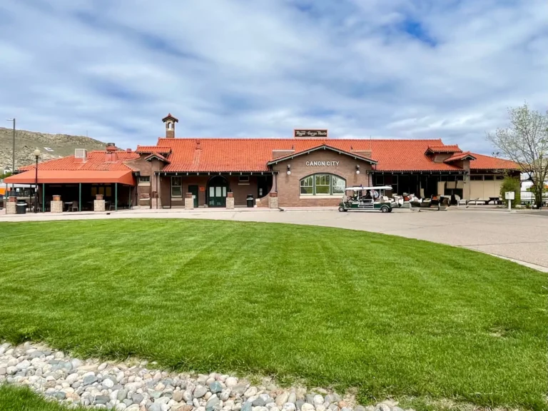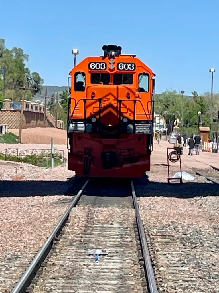 Our journey to the Royal Gorge Railroad found us traveling to the quaint small town of Cañon City, Colorado, in the West. There was a bit more traffic in the town than we had expected. On this particular Saturday, the town was having its annual Music & Blossom Festival. Every park had tents and booths surrounding different music venues. Parking was no problem, though. There were plenty of spaces set aside for railroad passengers, and they were free. We arrived an hour before departure, not knowing what to expect. Since we had our e-tickets, we had plenty of time to explore the depot and the Happy Endings Caboose Cafe. We took a few pictures of our transportation for the day. A staff member instructed us to line up at gate 3, based on our assigned seats. A short time later, the “All Aboard” call was announced, and we were on the train.